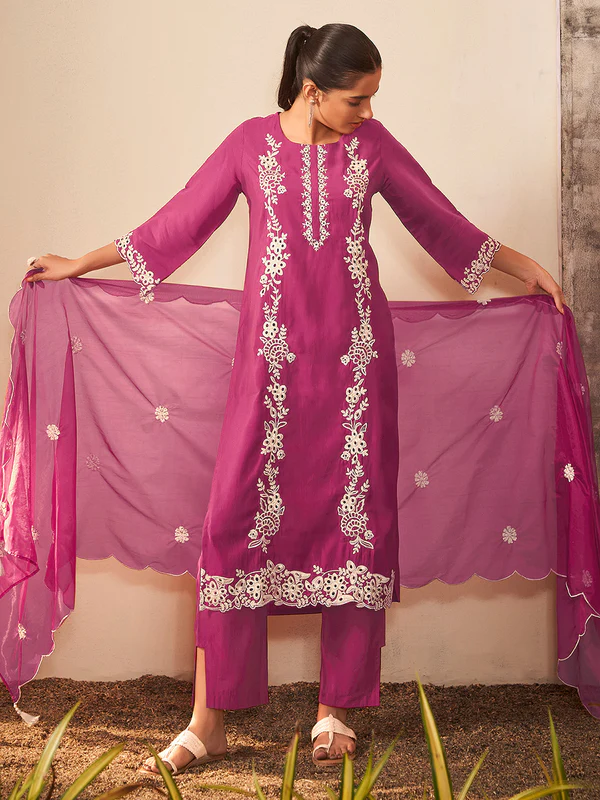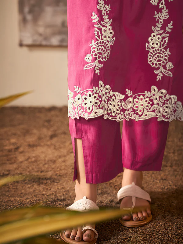 Magenta Silk Blend Schiffli Embroidered Straight Kurta Set